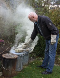 Met een speciale lange raku-tang worden nu de kommetjes in de vuurgloed en/of in de vlammen geplaatst. Doordat de oven open is geweest is de temperatuur aardig gedaald, maar die is binnen enkele minuten wel weer op het oorspronkelijke niveau.